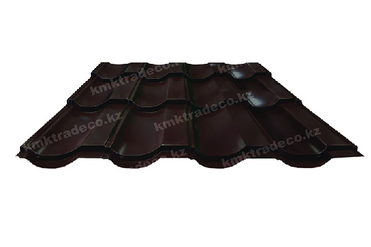 Металлическая кровля имеет максимальное сходство с натуральной черепицей. Листы изготовлены из тонколистовой стали толщиной 0.40 мм с МАТТ (матовым) покрытием премиум-класса – придаёт поверхности кровли необычный матовый «бархатистый» вид. Цвет – RAL 8017 Графитовый серый. Высота профиля – 25+/-1 мм.