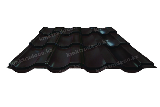 Металлическая кровля имеет максимальное сходство с натуральной черепицей. Листы изготовлены из тонколистовой стали толщиной 0.50 мм с МАТТ (матовым) покрытием премиум-класса – придаёт поверхности кровли необычный матовый «бархатистый» вид. Цвет – RAL 8019 Серо-коричневый. Высота профиля – 25+/-1 мм.