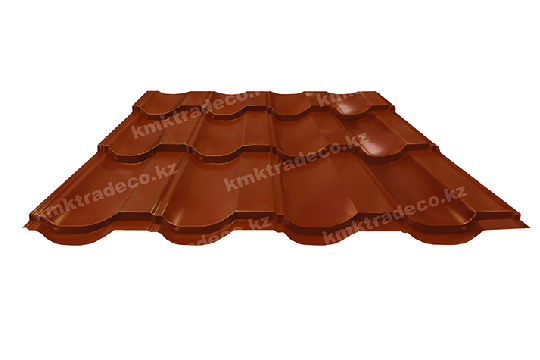 Металлочерепица Панорама – один из самых популярных видов данного кровельного материала. Металлическая кровля имеет максимальное сходство с натуральной черепицей. Листы изготовлены из тонколистовой стали толщиной 0.45 мм с полимерным защитным слоем. Цвет – RAL 8004 Медно-коричневый. Высота профиля – 25+/-1 мм.