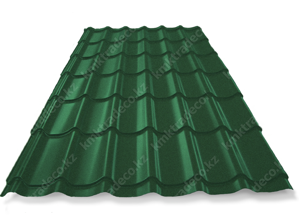 Металлическая кровля имеет максимальное сходство с натуральной черепицей. Листы изготовлены из тонколистовой стали толщиной 0.40 мм с МАТТ (матовым) покрытием премиум-класса – придаёт поверхности кровли необычный матовый «бархатистый» вид. Цвет – RAL 6005 Зеленый мох. Высота профиля – 25+/-1 мм.