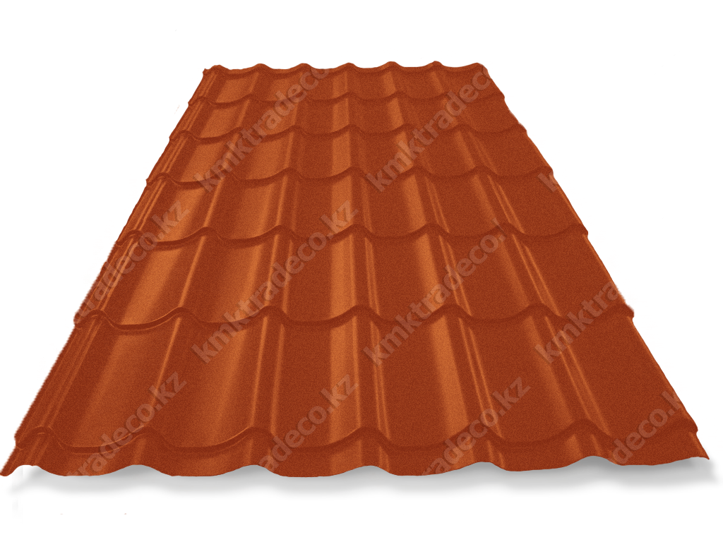 Металлическая кровля имеет максимальное сходство с натуральной черепицей. Листы изготовлены из тонколистовой стали толщиной 0.45 мм с МАТТ (матовым) покрытием премиум-класса – придаёт поверхности кровли необычный матовый «бархатистый» вид. Цвет – RAL 8004 Медно-коричневый. Высота профиля – 25+/-1 мм.