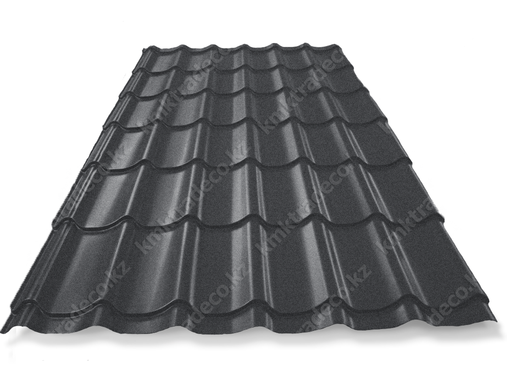 Металлическая кровля имеет максимальное сходство с натуральной черепицей. Листы изготовлены из тонколистовой стали толщиной 0.50 мм с МАТТ (матовым) покрытием премиум-класса – придаёт поверхности кровли необычный матовый «бархатистый» вид. Цвет – RAL 7024 Графитовый серый. Высота профиля – 25+/-1 мм.