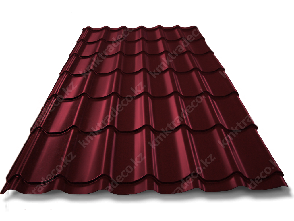 Металлочерепица Супермонтеррей – один из самых популярных видов данного кровельного материала. Металлическая кровля имеет максимальное сходство с натуральной черепицей. Листы изготовлены из тонколистовой стали толщиной 0.4 мм с полимерным защитным слоем. Цвет – RAL 3005 Винно-красный. Высота профиля – 25+/-1 мм.